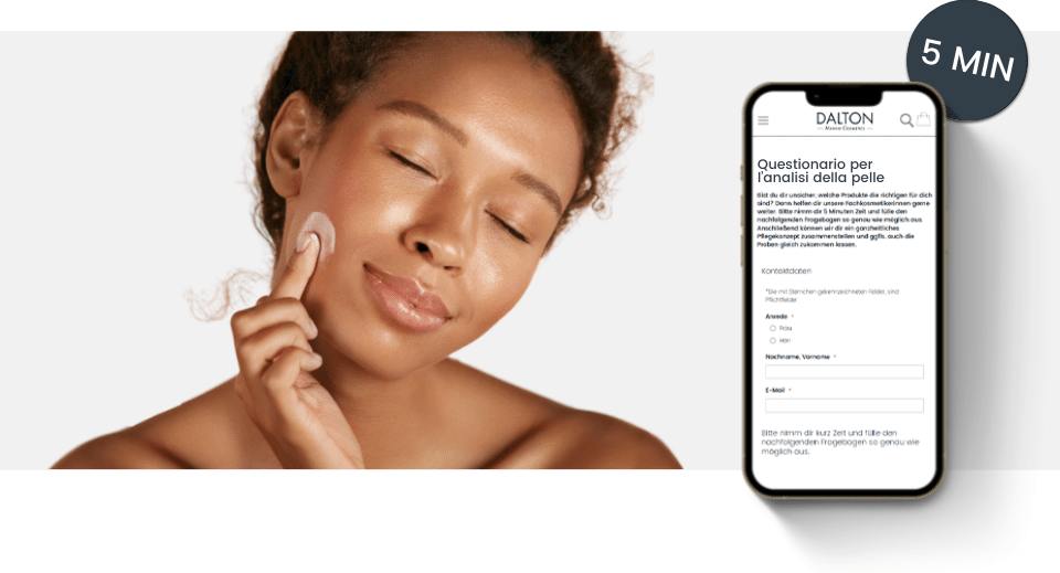 Rispondi al questionario DALTON per ricevere consigli personalizzati sui prodotti da utilizzare da parte delle esperte di cosmetica DALTON. Bastano 5 minuti!